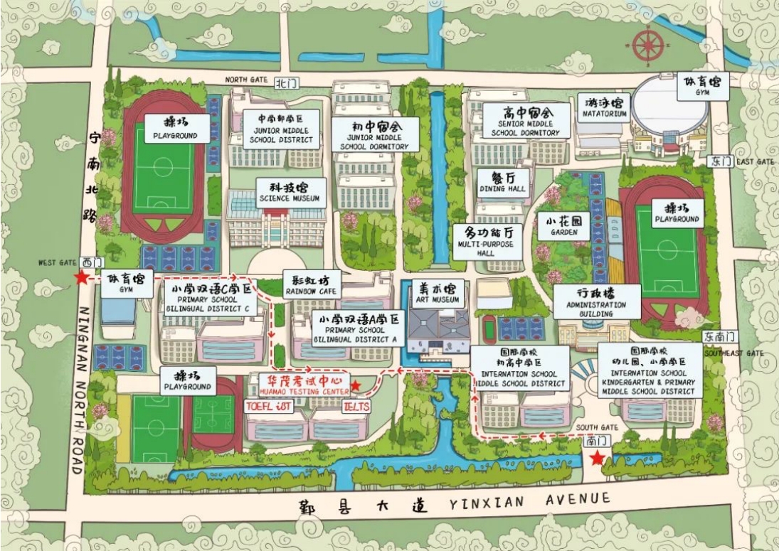 华茂考试中心位于宁波华茂外国语学校内(浙江省宁波市鄞州区鄞县大道中段2号),所有考生由宁波华茂外国语学校南门(鄞县大道中段2号)或宁波华茂外国语学校西门(宁南北路1386号)进出,南门、西门距离华茂考试中心约5分钟步行路程。